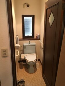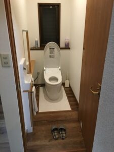 堺市I様邸トイレリフォーム BEFORE リフォームの要望 内開きの為、履物がトイレの手前に置いておけない事やドアの敷居が大きくて気をつけないとつまづく。 奥の狭い所の掃除が大変だし、手すりを使いながら手を洗うのが危ないと感じる。 リフォームのポイント ドアを引き込み戸に代えてバリアフリーに! 手洗い器を手前に設置! フタや洗浄の自動化でよけいな手間を軽減! 紙巻器を二連にすれば使用中の交換いらず! AFTER 物件 堺市I様邸トイレリフォーム 総工費 700,000円 施行部位 便器、床、ドア、クロス 工期 6日