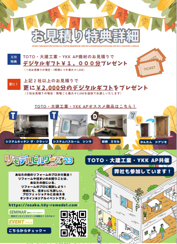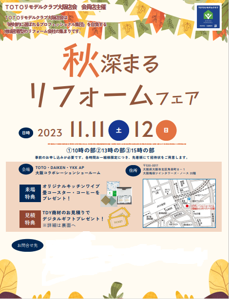 2023.10.23 秋深まるリフォームフェアのお知らせ リフォームフェア開催のお知らせです。 期日:2023年11月11日(土)・12日(日) 時間:10:00-17:00 ①10:00の部 ②13:00の部 ③15:00の部 会場:TOTO・DAIKEN・YKK AP大阪コラボレーションショールーム *ご来場は事前のお申込みが必要です。詳しくは神崎ガスセンター迄お問合せ下さい。 一覧へ戻る